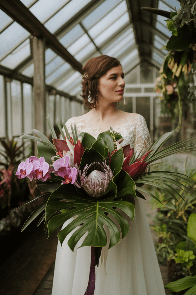 If you’re tying the knot in a greenhouse, lean into botanicals with orchids, tropical leaves, and unusual blooms like protea. It’s whimsical and fresh.