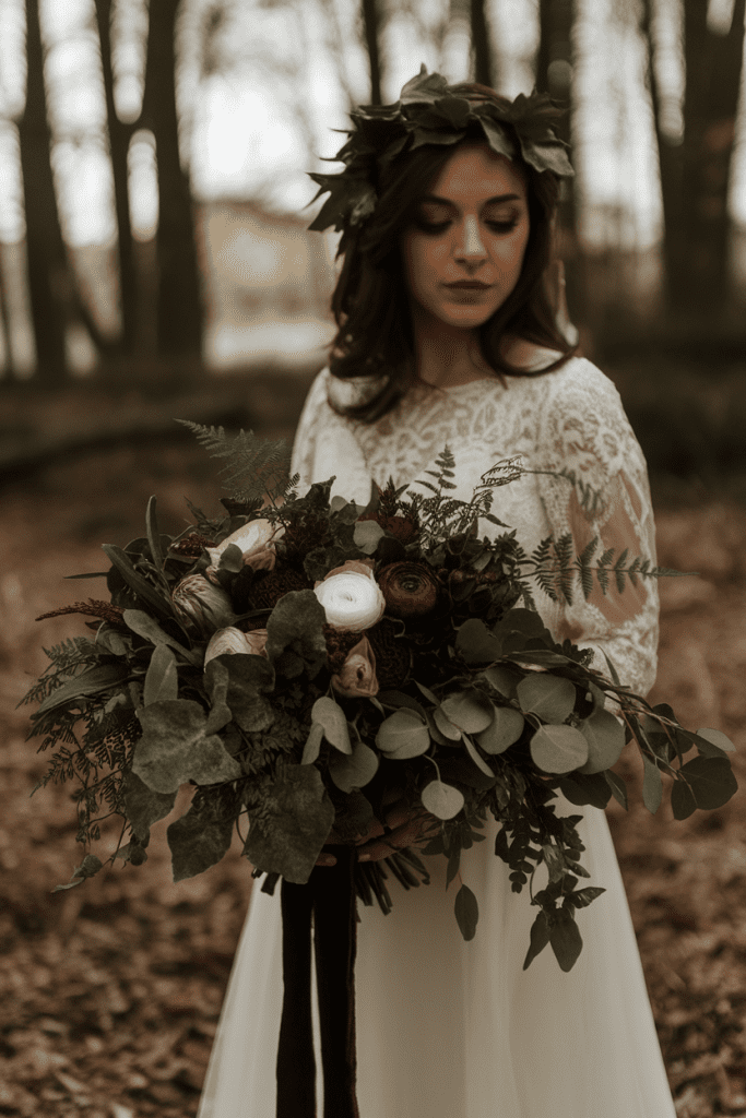 For a forest or woodland wedding, go heavy on greens: eucalyptus, ferns, ivy. Add dark florals like burgundy ranunculus or deep purple dahlias for mood.
