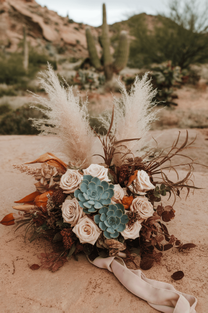 A desert venue is all about texture and earth tones. Succulents mixed with cream roses and dried accents like pampas grass look chic and unexpected.