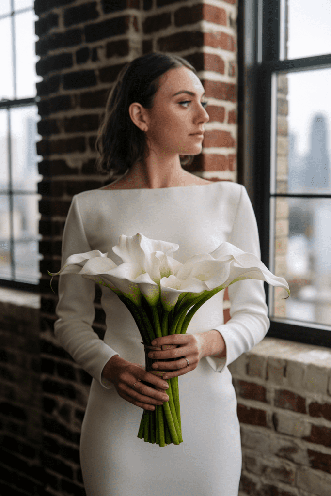 A chic loft with exposed brick and city views calls for sleek modern vibes. A monochrome bouquet—like all-white calla lilies or all-pink peonies—makes a statement.