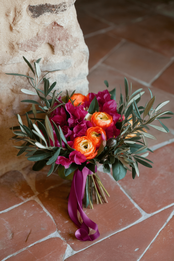 Getting married in a villa in Italy or Spain? Channel that Mediterranean charm with vibrant bougainvillea, orange ranunculus, and olive branches.
