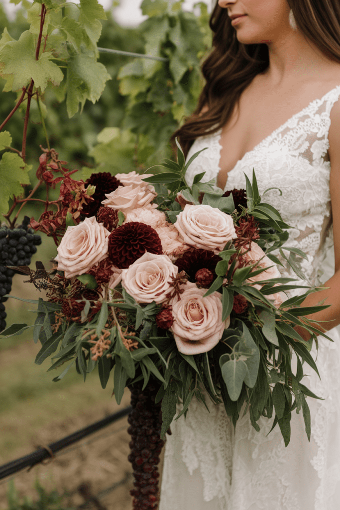 A vineyard is lush and romantic, so why not lean into it? Mix blush roses with greenery and even grapevine tendrils for a subtle nod to the setting.