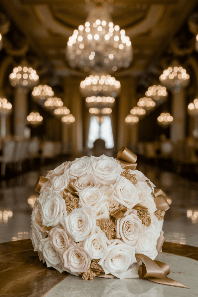 In a grand ballroom, your bouquet has to hold its own against chandeliers and marble floors. A structured, tightly packed arrangement of white or blush roses feels timeless and luxe.