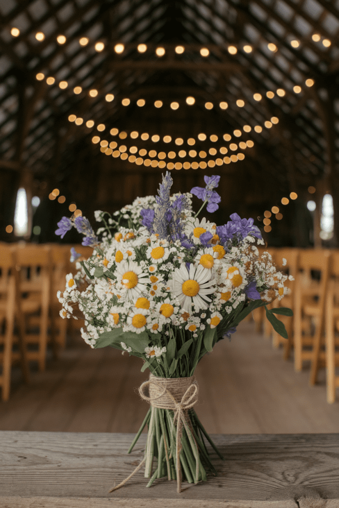 Barn weddings are cozy, fun, and rustic chic. A bouquet of wildflowers—daisies, cornflowers, lavender, and greenery—fits the laid-back vibe.