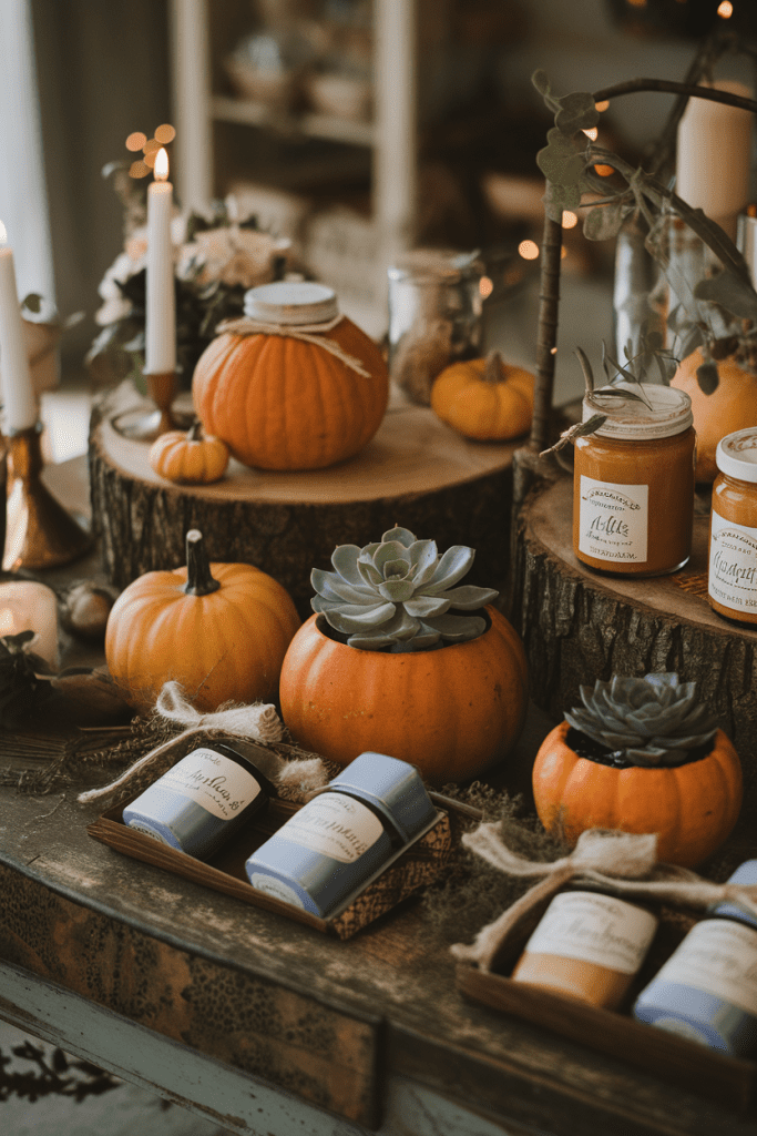 Send guests home with chic pumpkin-themed favors. Think pumpkin-scented candles, pumpkin butter jars with cute labels, or mini pumpkin succulents. No one needs another keychain.