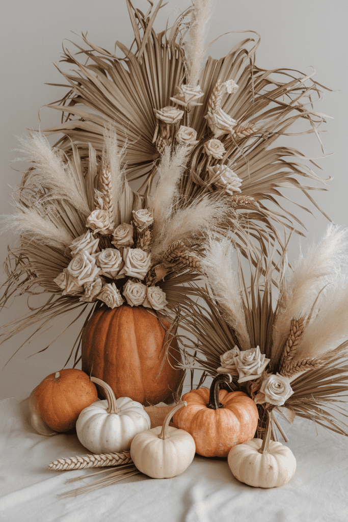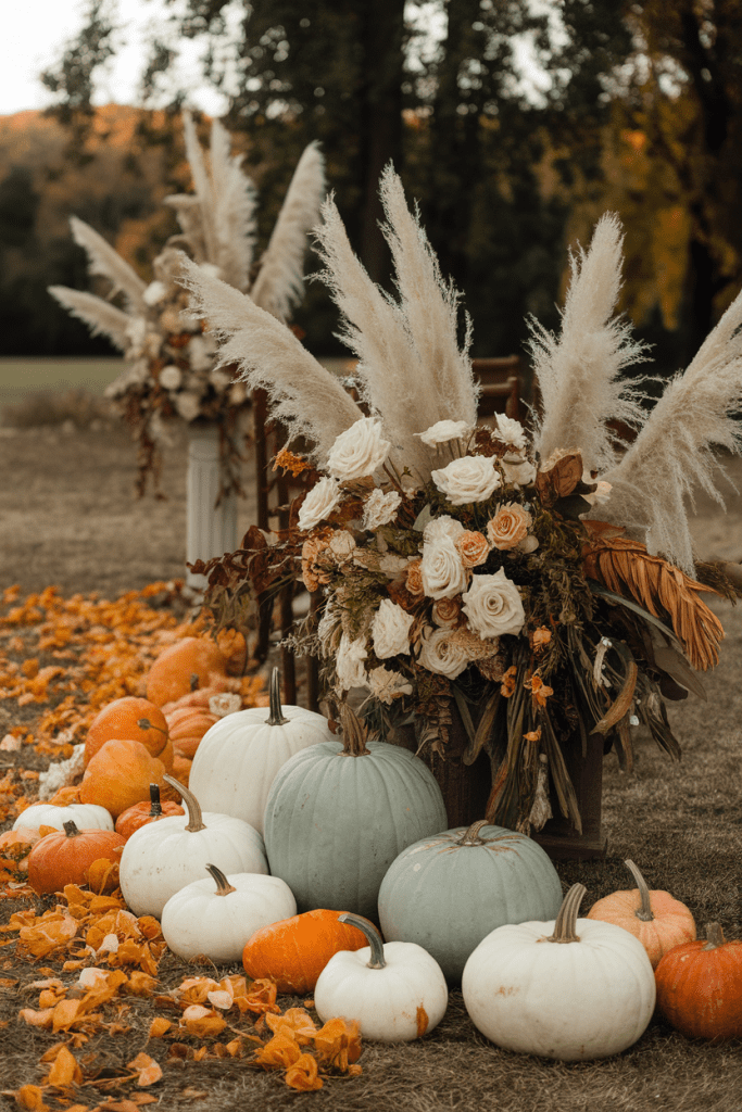 Ceremonies need drama, and pumpkins bring it when styled right. Think a semi-circle of white and sage pumpkins at the altar, layered with dried pampas grass and seasonal flowers. It’s earthy, modern, and totally photogenic.