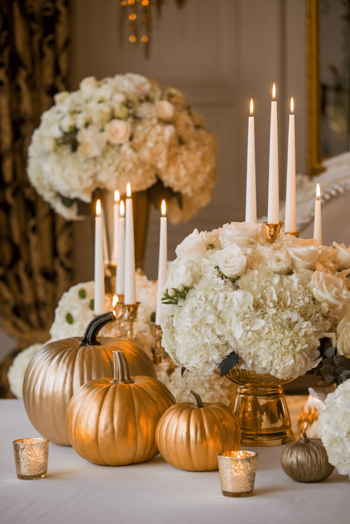 Velvet screams luxury, and when you drop a few pumpkins along a velvet runner, it goes from “harvest” to “haute.” Imagine deep emerald or burgundy velvet tables with pale pumpkins sprinkled like jewels. It’s the easiest way to bring warmth and drama without going overboard.