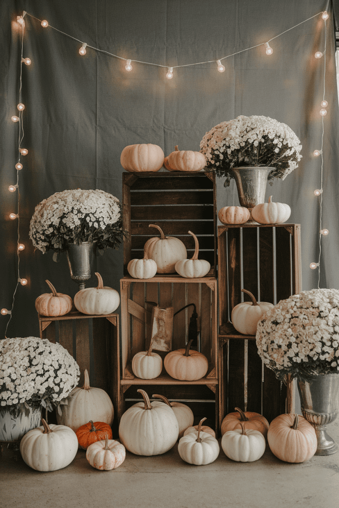 Tip: Mix sizes for depth—tiny minis with oversized showstoppers. Add a metallic accent like gold leaf or silver paint if you’re feeling extra. Guests will think you hired a professional stylist when really, you just swapped orange for ivory.