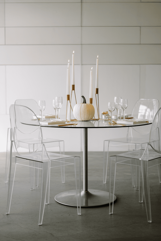 Minimalist brides, this one’s for you. Picture sleek white tables with just a single pumpkin per table—clean, intentional, and chic. Pair it with acrylic chairs and geometric candleholders for that modern look.