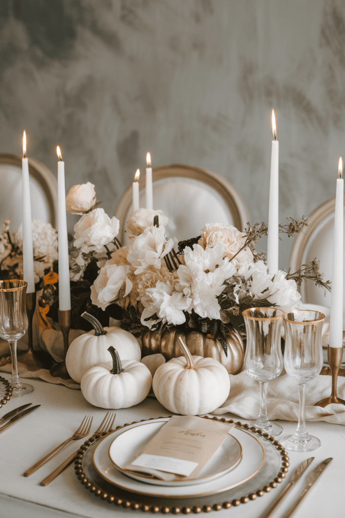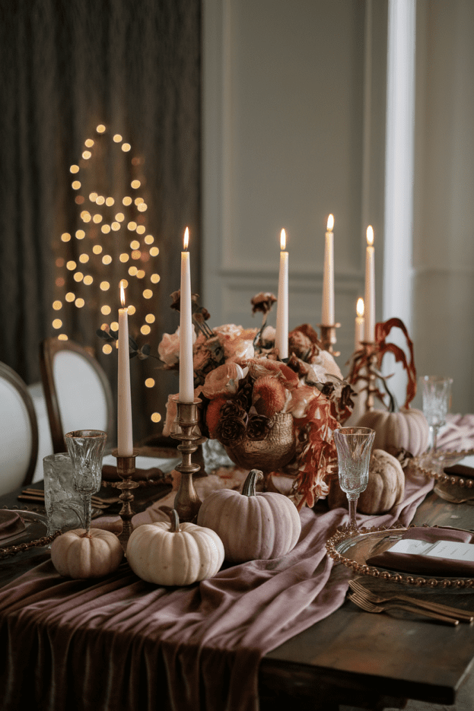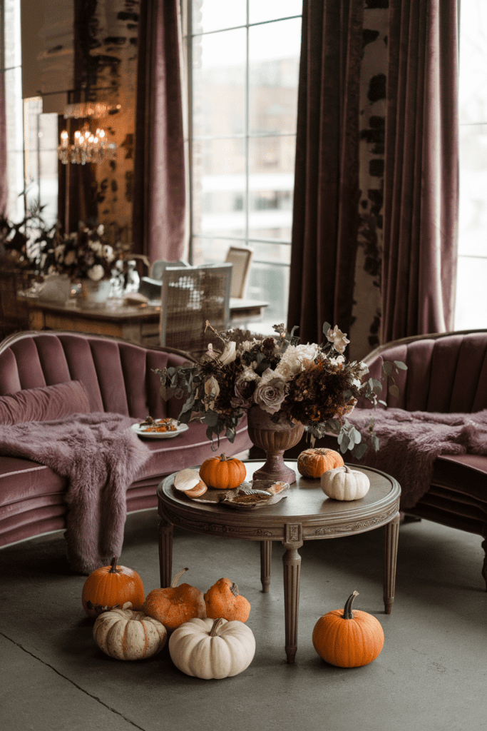 Styling hack: Skip the plain orange pumpkins and stick to muted tones (white, sage, dusty rose). Add tapered candles in brass holders for that moody glow.