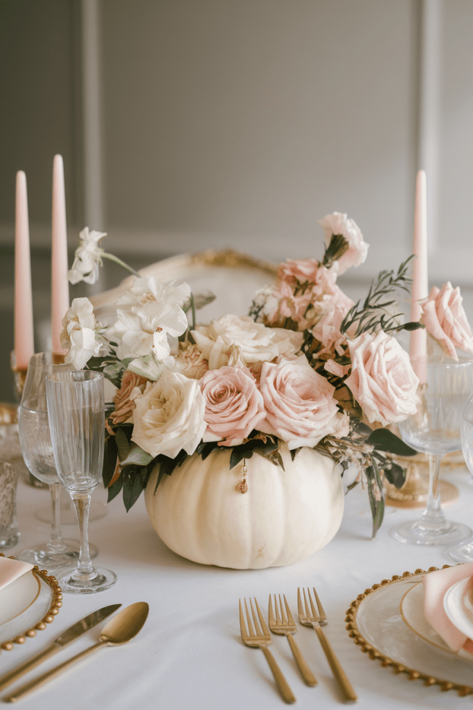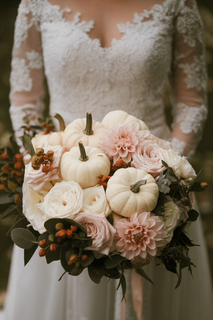 Tiny pumpkins in a bridal bouquet? Risky, but hear me out. Use baby white pumpkins tucked among roses and dahlias. It adds whimsy without veering into costume territory.