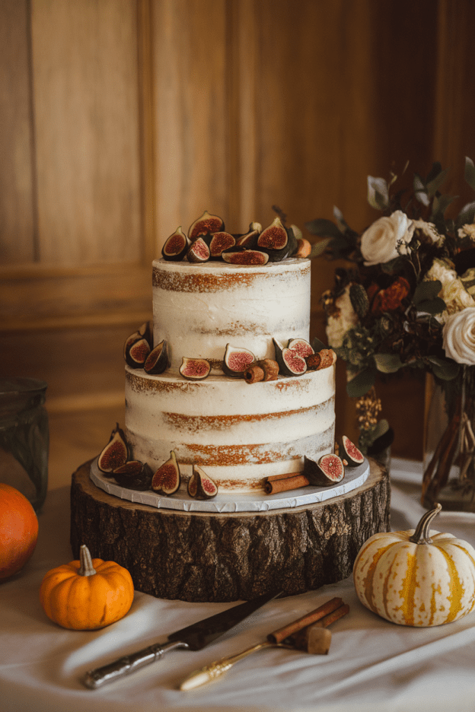 Tip: Go naked cake style (minimal frosting) and pair with figs, cinnamon sticks, and tiny pumpkins for that organic harvest vibe.