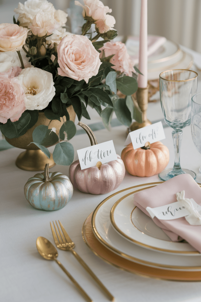 Metallic pumpkins are having a moment. Spray them in gold, copper, or rose gold for that luxe vibe. Scatter them around the reception space, use them in centerpieces, or line the cake table.