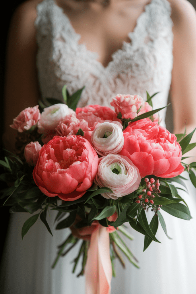 Coral peonies mixed with blush ranunculus create a playful bouquet that feels whimsical and flirty. Add pops of greenery for balance.