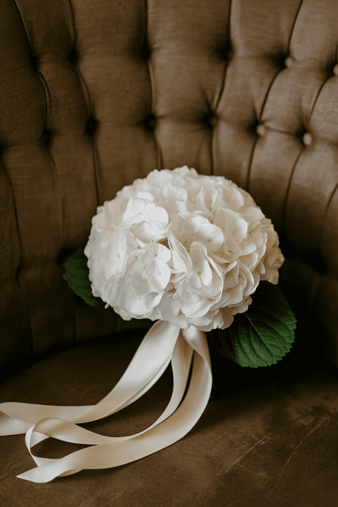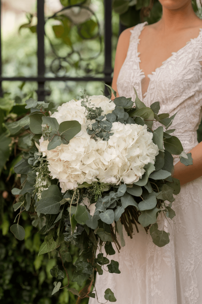 White hydrangeas with trailing greenery create an elegant bouquet that feels light and airy. Think less “traditional white bouquet” and more “enchanted garden.”