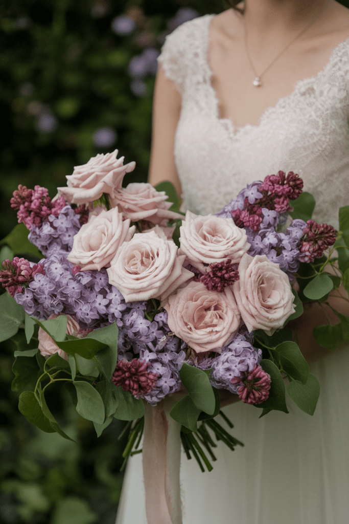 Lilacs don’t just smell divine—they also bring delicate texture and soft purple hues. Paired with garden roses, they feel storybook perfect.