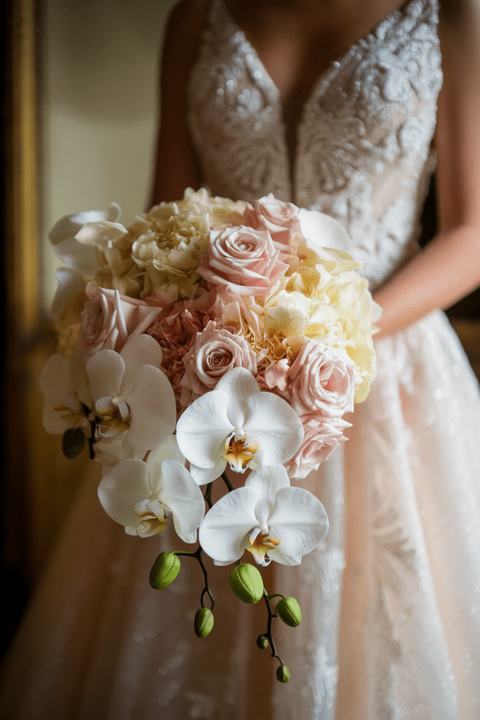 Orchids cascading with hydrangeas and roses create a luxurious yet whimsical bouquet. They’re elegant, but the trailing effect softens the look.