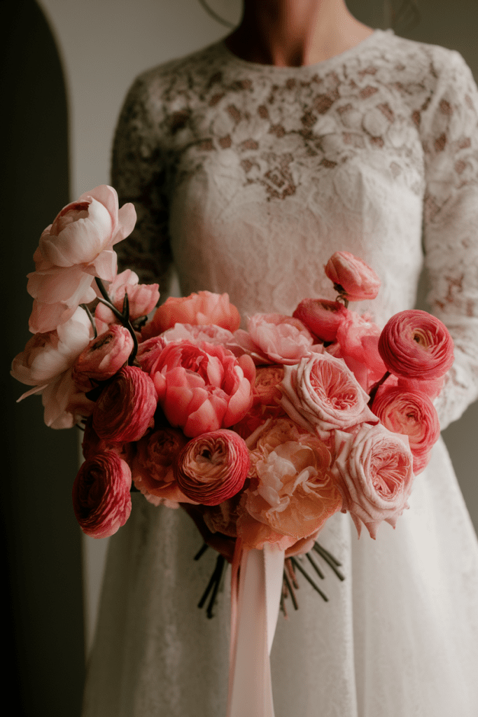 Bouquets that fade from one color to another—say blush to coral to peach—are striking and romantic. Peonies, ranunculus, and roses pull this off beautifully.