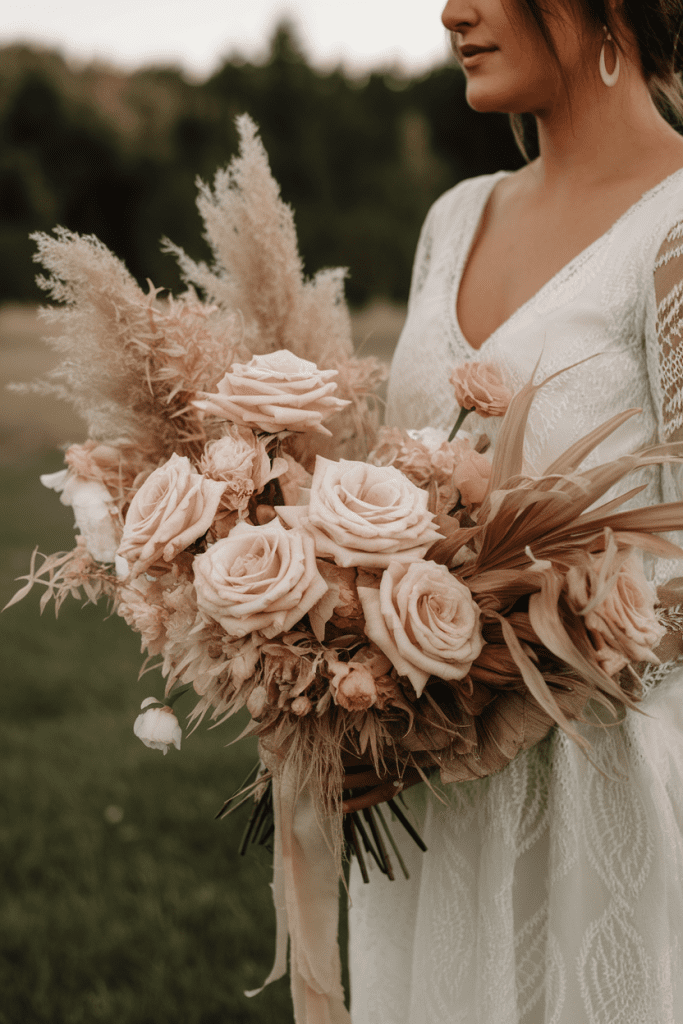Mixing dried flowers (like pampas or bleached ruscus) with fresh blooms adds texture and a whimsical twist. It feels modern while still rooted in romance.