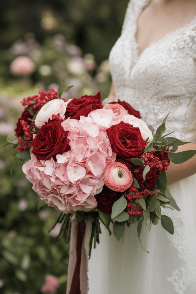 Red roses can feel too formal, but when you soften them with blush hydrangeas and pink ranunculus, they transform into a bold yet whimsical statement.