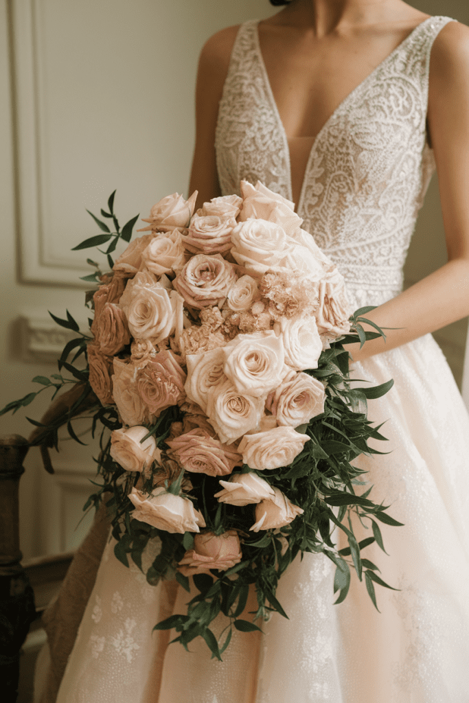 Cascading bouquets scream romance, and when they’re made of garden roses, they give full-on Bridgerton energy. The trailing design adds drama without feeling fussy.