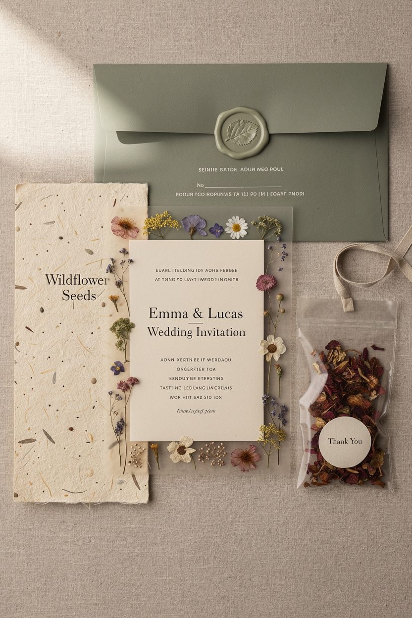 Organic textures turn a simple design into something special. Press a few wildflowers and sandwich them between two vellum sheets. It’s delicate, dimensional, and very Pinterest-core. Other nature-forward touches: