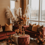 Create mini lounges for conversation breaks. Style velvet or linen seating with side tables, then place large urns or floor baskets of seasonal greenery nearby. Add a low lamp or candle cluster for warmth. The space feels intentional and intimate.