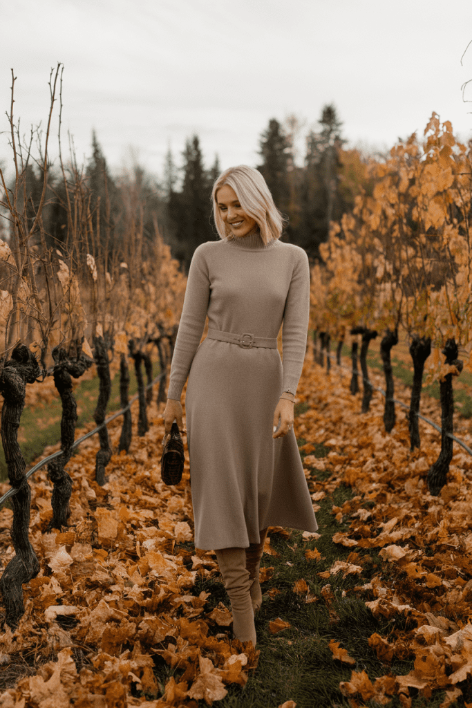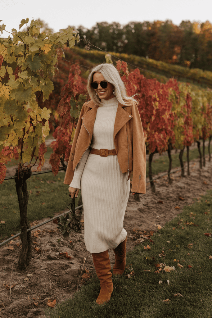 Try a cream knit midi with a belt and tall boots. Add a suede jacket for vineyard-ready layering. Comfortable, stylish, and totally rewearable.