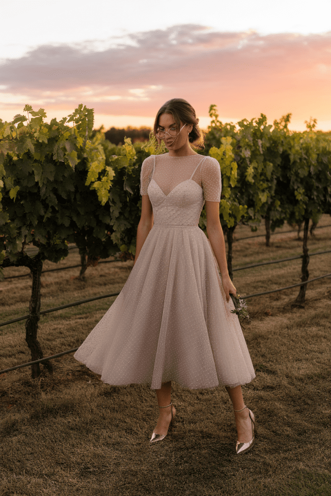 Wear a sequined midi with neutral heels and let the dress shine (literally). Perfect for evening barn receptions or vineyard dinners.