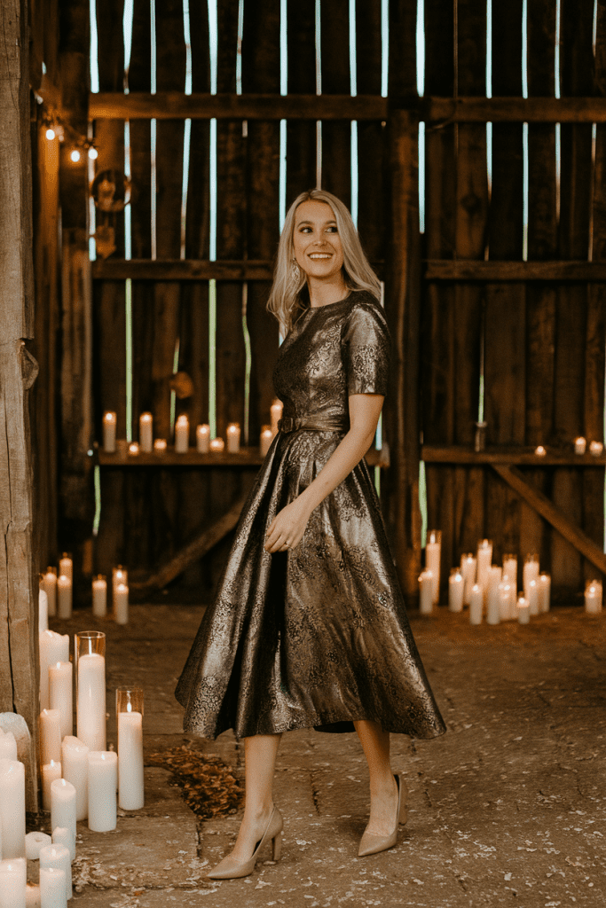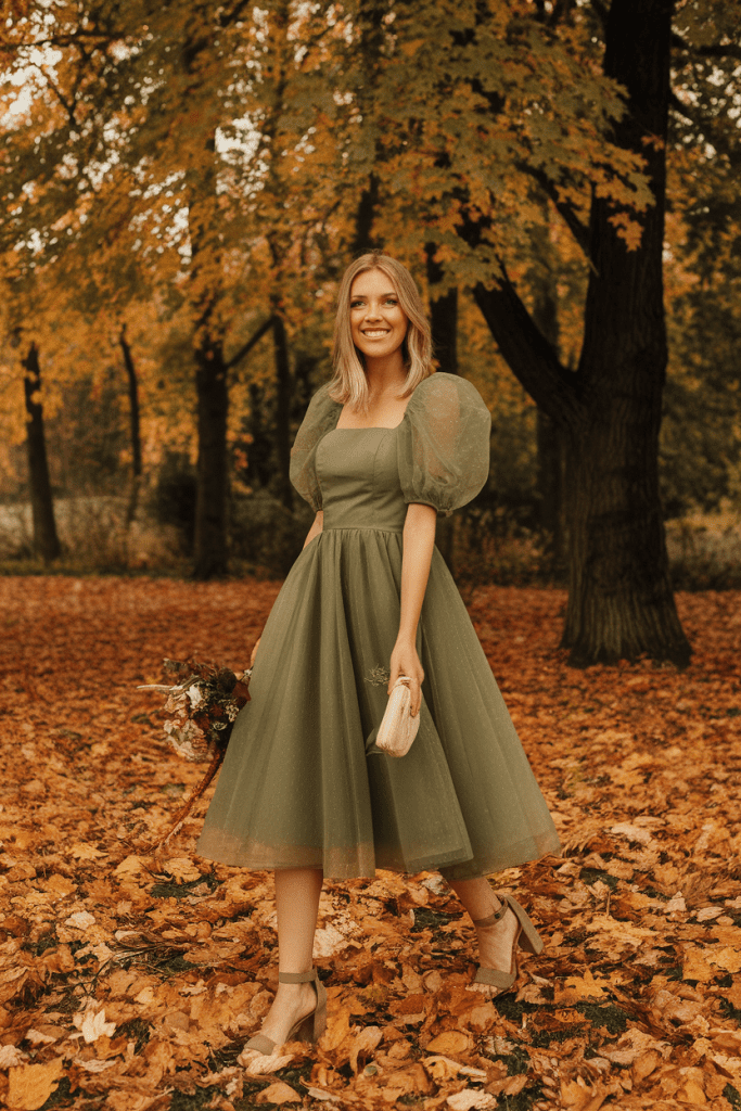Try a jewel-toned velvet wrap dress with block heels. It’s cozy but not suffocating, and it fits right in at rustic barns or elegant ballrooms. Bonus: velvet photographs insanely well against autumn leaves.