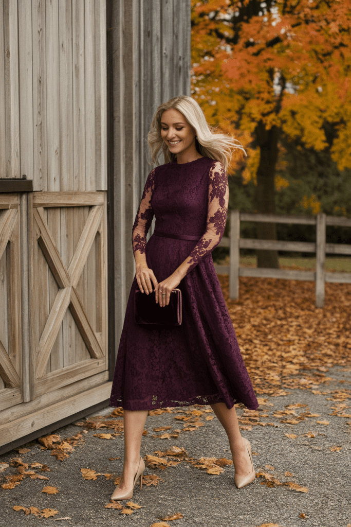 Try a plum lace midi with sheer sleeves, paired with nude heels. Add a velvet clutch for a layered textural look that feels intentional.