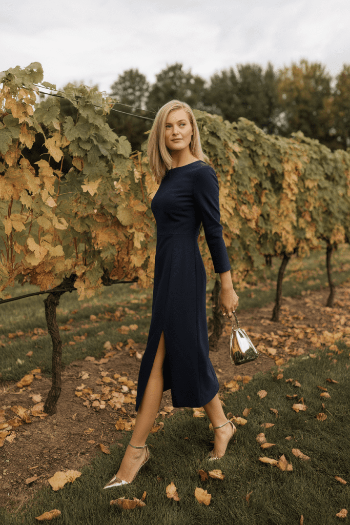 Go for a navy crepe midi with a slit, styled with metallic heels. It’s streamlined, chic, and secretly very comfortable.