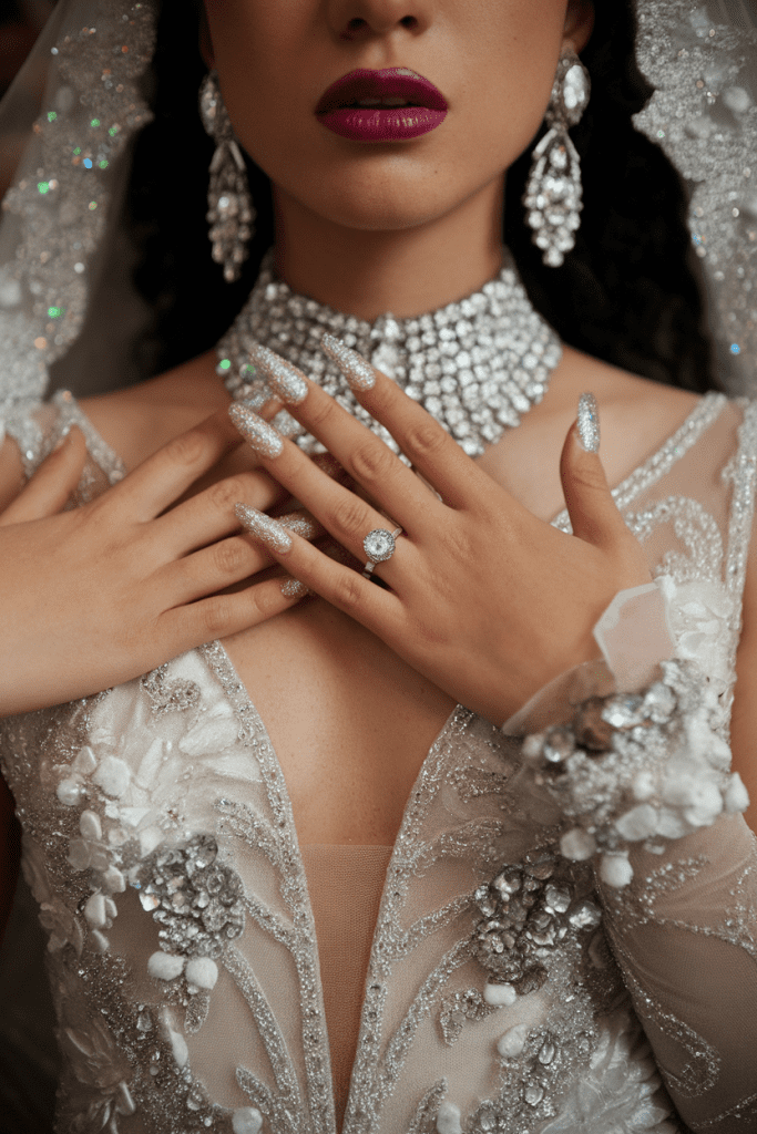 The early 2000s saw a surge of glitter, rhinestones, and shimmer in bridal nails. Brides embraced extra sparkle to match embellished gowns and sparkling accessories. Acrylic nails also became mainstream, allowing brides to achieve longer and more dramatic looks. The trend reflected the glamour-heavy fashion of the era, where maximalism was celebrated. Nail art began appearing more frequently, from rhinestone accents to bold patterns. For brides, nails became a statement accessory rather than just a finishing detail. The 2000s represented a shift toward personalization and extravagance in bridal beauty.