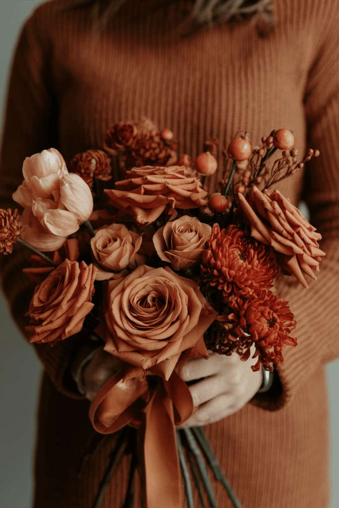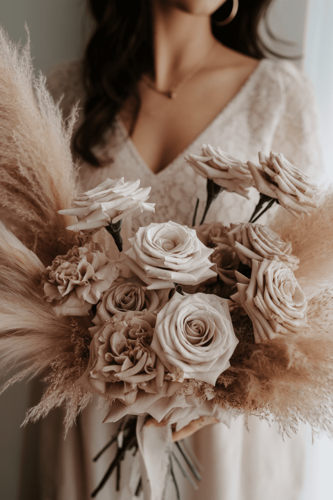 Neutral doesn’t mean boring. Beige roses, taupe carnations, and pampas grass create that dreamy “boho but polished” look. Perfect for vineyard or barn weddings.