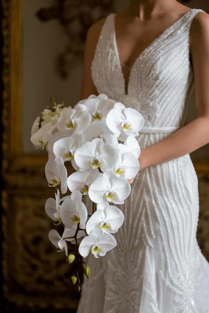 If you’re a luxe winter bride, nothing tops orchids. All-white orchids feel couture and chic, especially in a cascading shape.