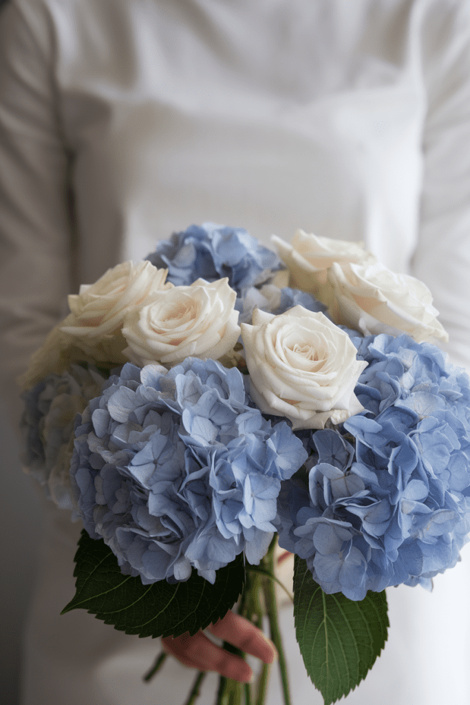 Blue hydrangeas are the ultimate summer bloom. Their voluminous clusters add a soft pop of color without overpowering your look. Pair with white roses for balance.