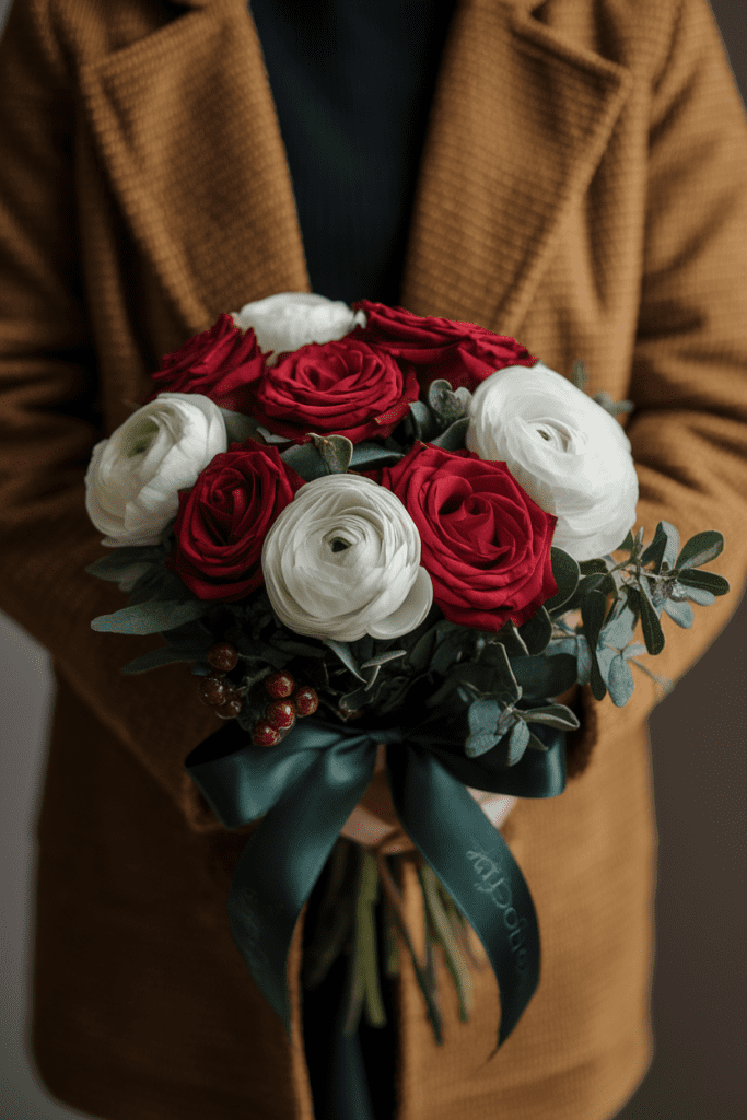 Nothing screams winter romance like red and white. Crimson roses paired with snowy ranunculus or white tulips give off cozy holiday elegance.