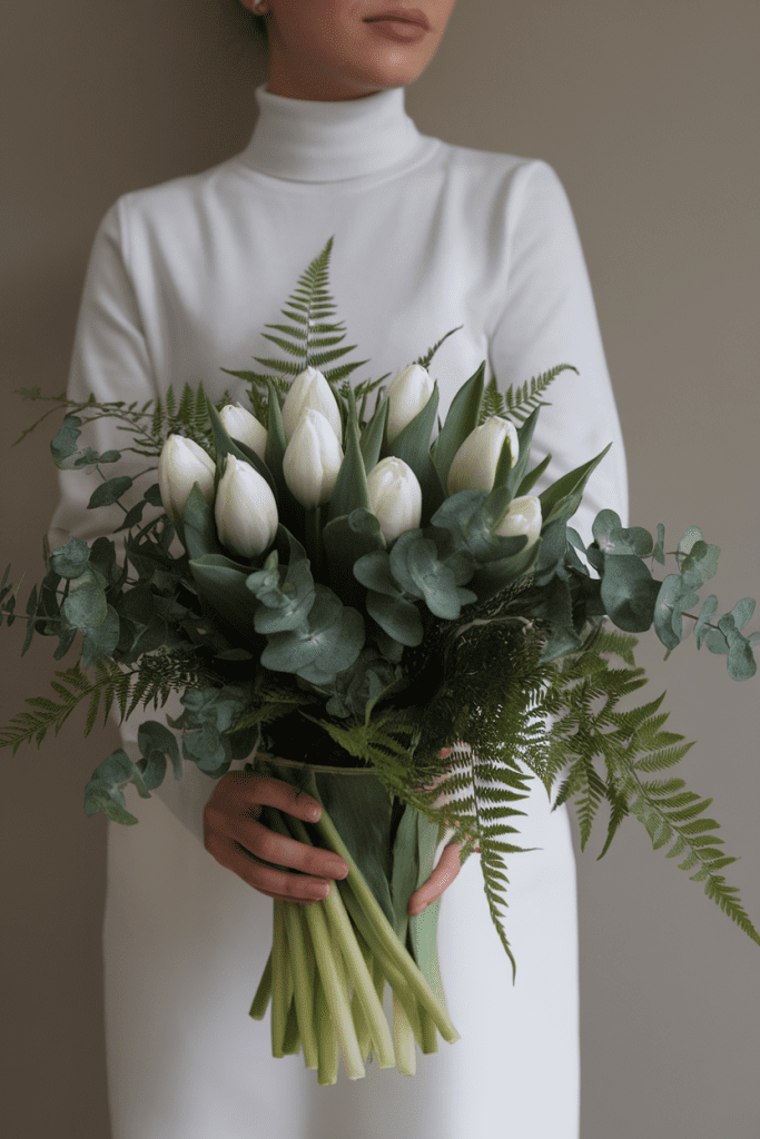 Green and white never go out of style, but in spring, they feel extra fresh. Picture white tulips or roses surrounded by lush eucalyptus and soft ferns. It’s minimalist yet chic.
