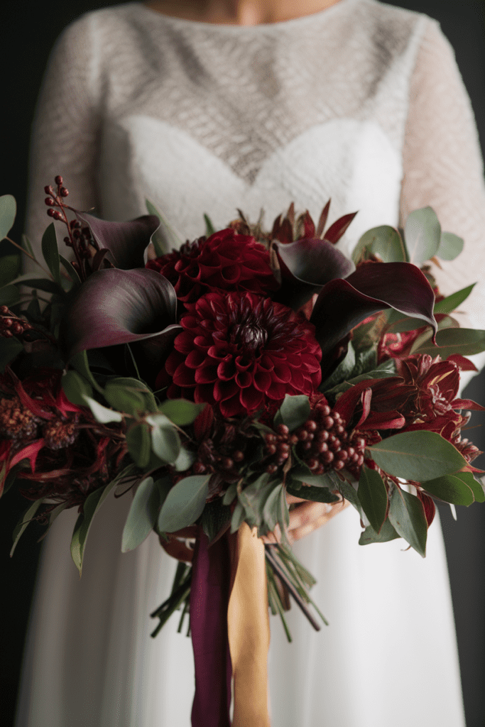 When fall rolls in, jewel tones become the star: emerald greens, burgundy dahlias, and deep plum calla lilies. These shades catch the moody autumn light perfectly, giving your photos richness and drama.