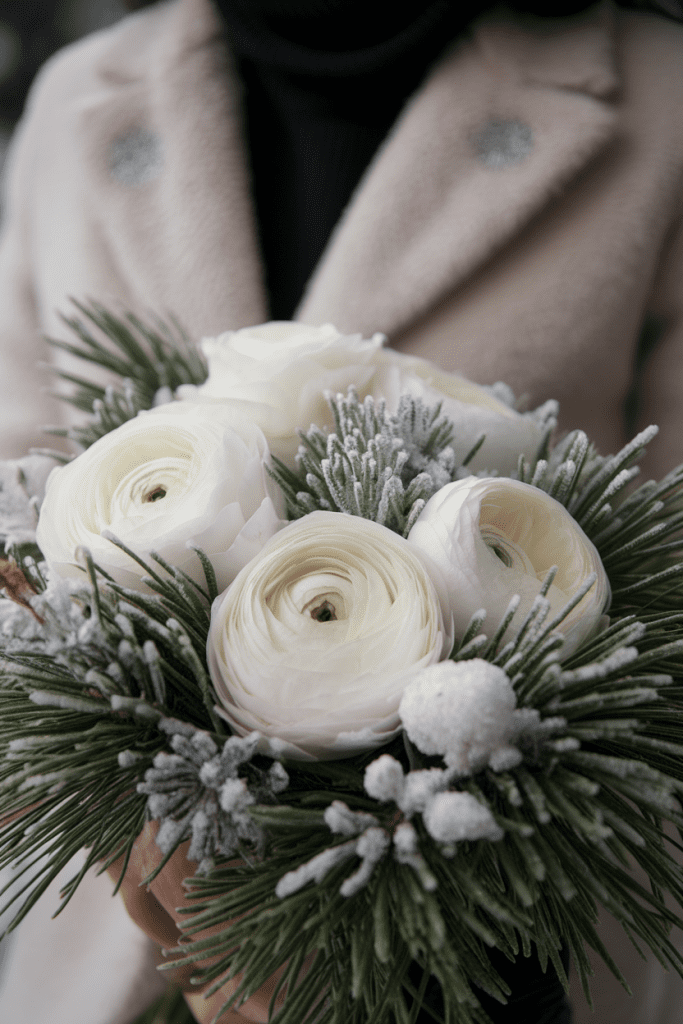 Tip: Metallic accents—like silver ribbon—make the bouquet feel extra winter luxe.