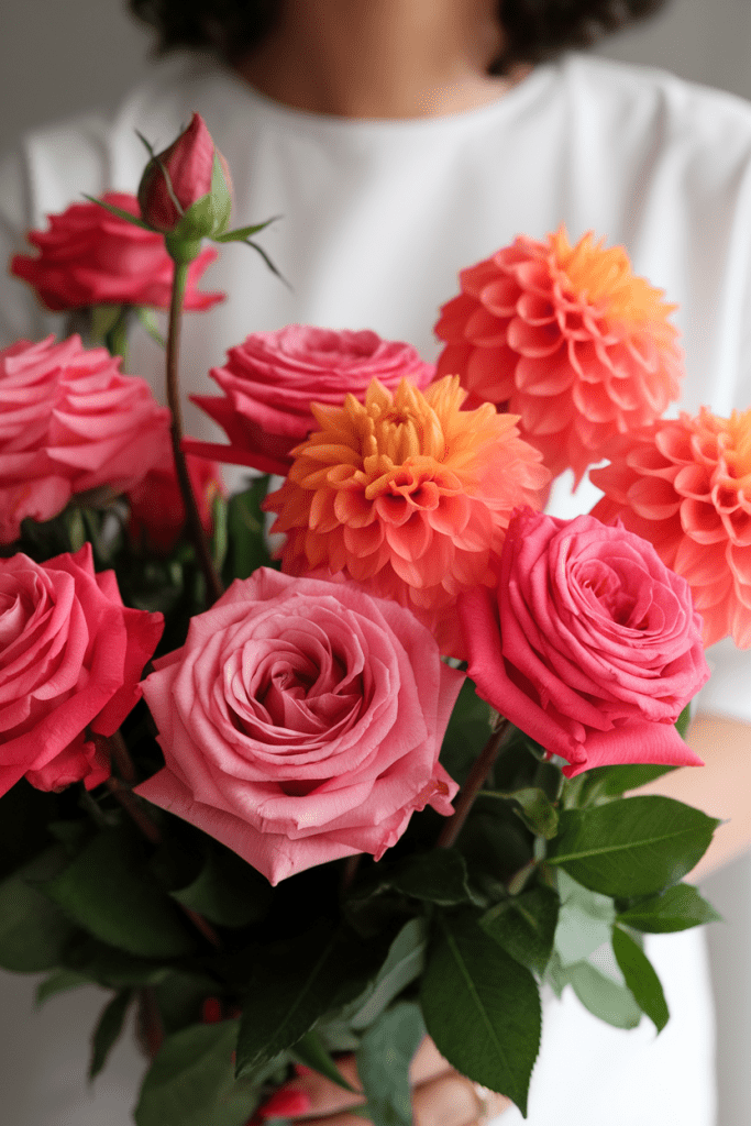 Summer deserves color that pops. Coral, hot pink, and orange roses create an energy-packed bouquet that feels like sunshine bottled up. Toss in dahlias for drama, and you’ve got yourself a bouquet that practically radiates joy.