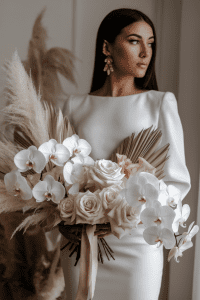 Neutral doesn’t mean boring. Beige roses, taupe carnations, and pampas grass create that dreamy “boho but polished” look. Perfect for vineyard or barn weddings.