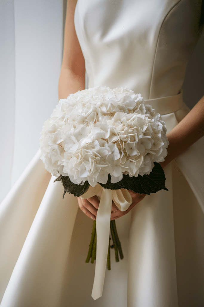 Hydrangeas bring volume without chaos. An all-white hydrangea bouquet looks cloud-like and elegant, perfect for brides who love symmetry.