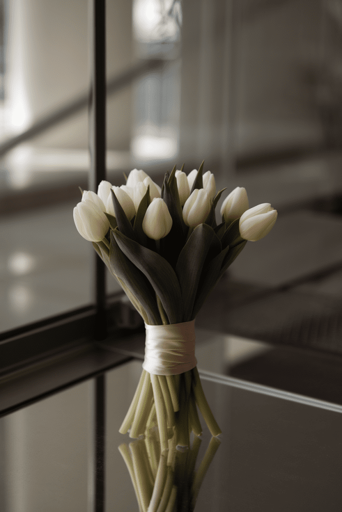 Pick one flower, pick one shade, and commit. Whether it’s white tulips, calla lilies, or all-ivory anemones, the effect is modern yet timeless.