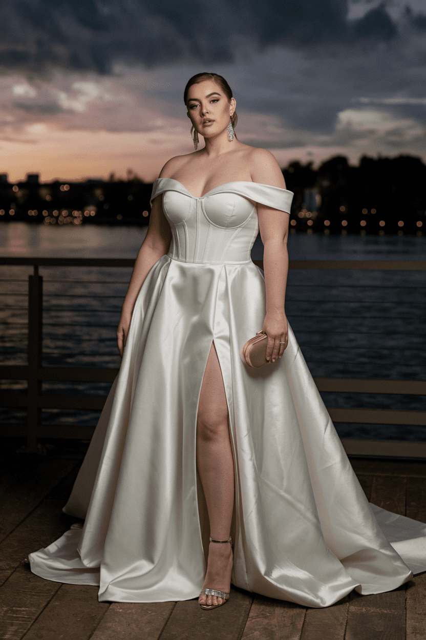 Classic Hollywood, but make it supportive. Off-the-shoulder straps frame your collarbones beautifully, and a side slit keeps the drama current. Satin gives that red-carpet sheen without going full glitter.