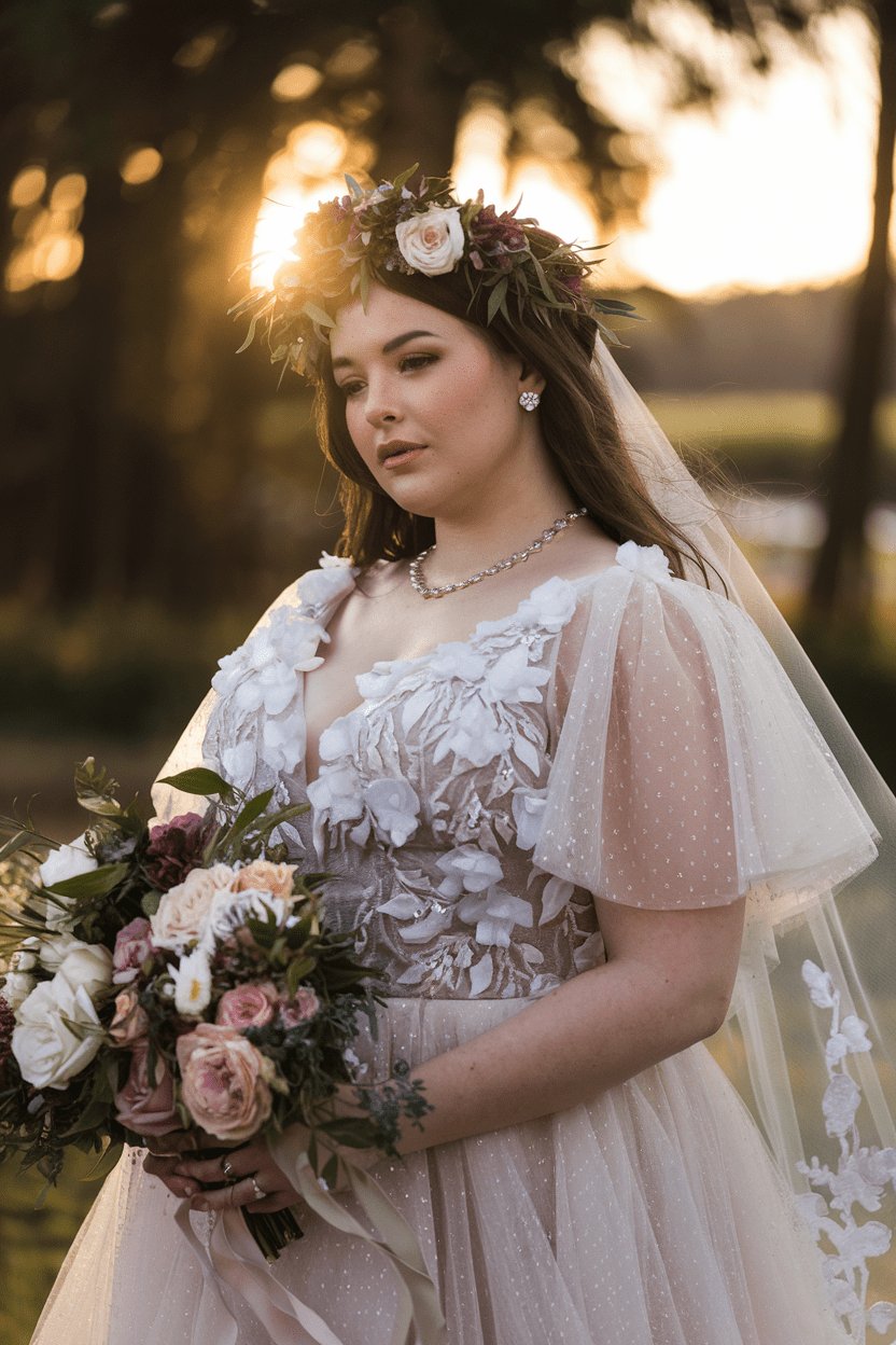 Ideal for forest clearings, barns, and beach sunsets. Swap the headband for a long veil sprinkled with floral appliqués if you want that ultra-romantic trail behind you. It’s boho, but elevated.