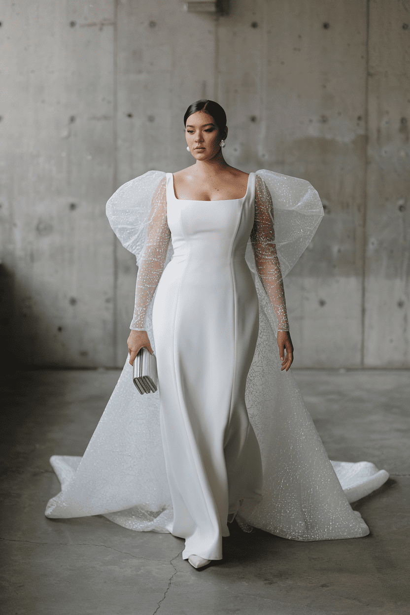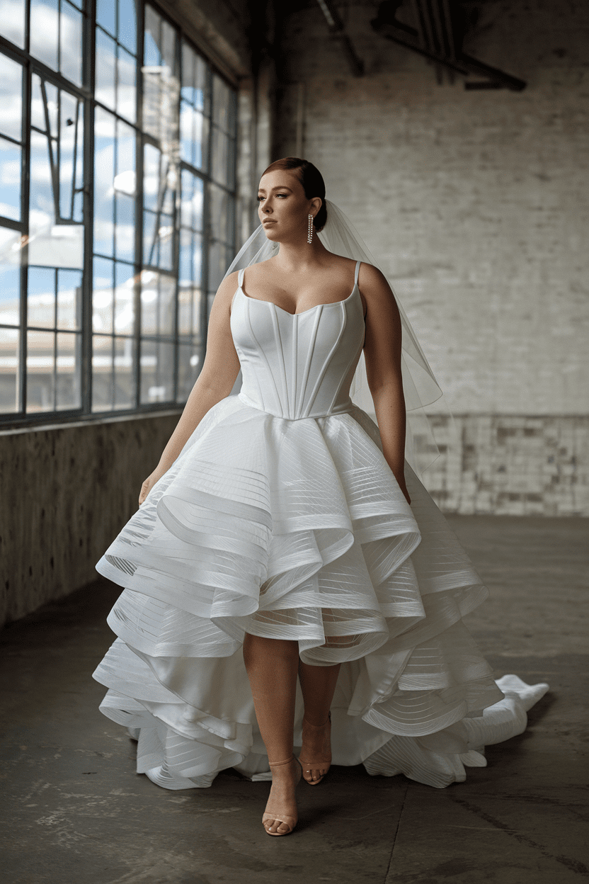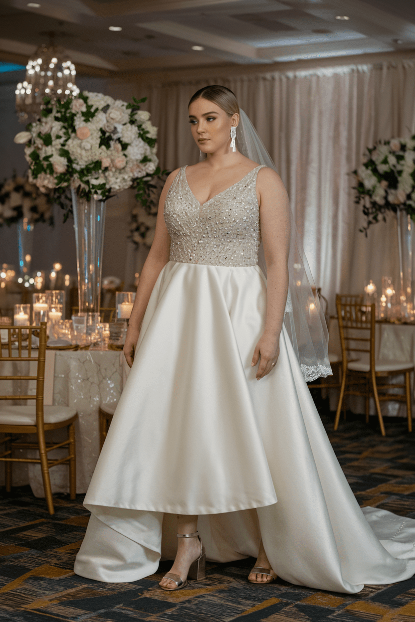 Great for fashion-forward venues, industrial lofts, or destination estates. Want more coverage? Add detachable off-the-shoulder sleeves. For a two-in-one, consider a ruffle overskirt that snaps off for the reception.