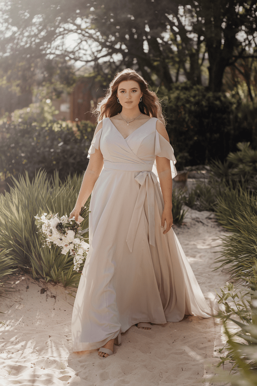 Perfect for beach ceremonies, garden vows, or intimate elopements. Add a shawl in cream or sand for cooler evenings. It’s relaxed elegance that still feels special in every shot.