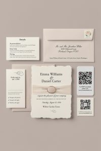 A clean details card with a QR code to your website keeps things streamlined and eco-friendly. If older guests appreciate paper RSVPs, include a small card for them only.