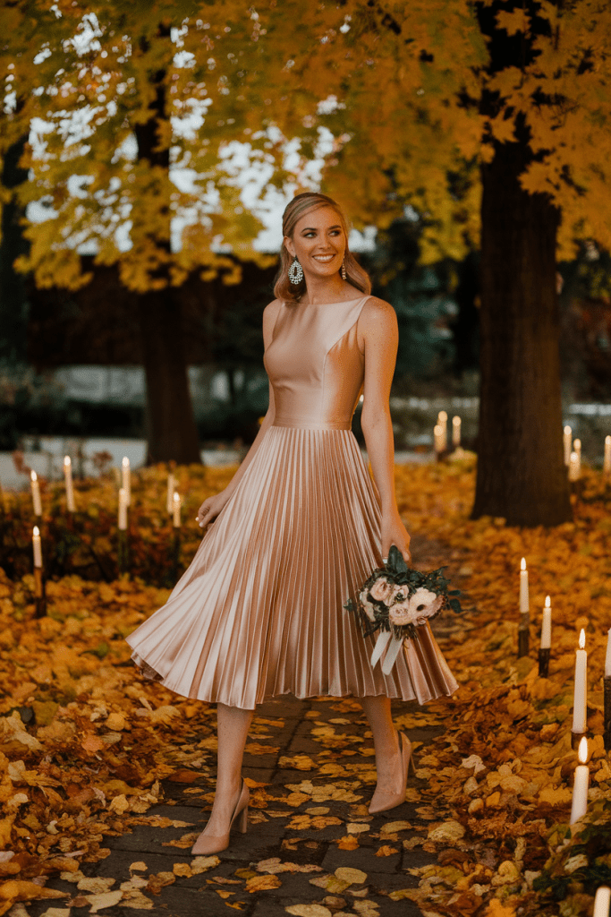 Choose a champagne pleated midi and style with sparkly earrings. Nude heels keep the look polished and versatile.